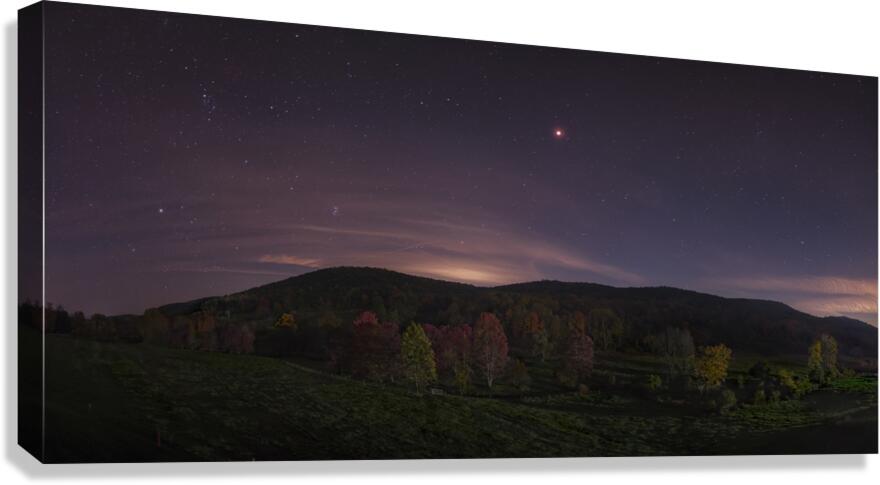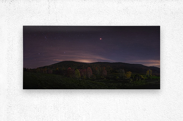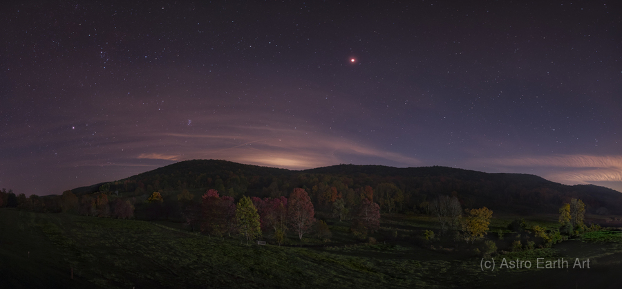 Mars rising over Oblong Valley in Sharon CT USA. The red planet over the red leaves of fall.